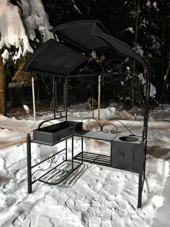 На лесной территории у дома располагается мангальная зона, решетки для жарки, шампура, печь для казана.
