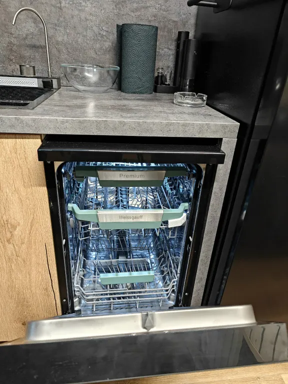 Посудомоечная машина, огромный двустворчатый холодильник с морозилкой, встроенная микроволновка, духовой шкаф, стиральная машина с сушкой.
