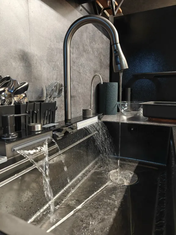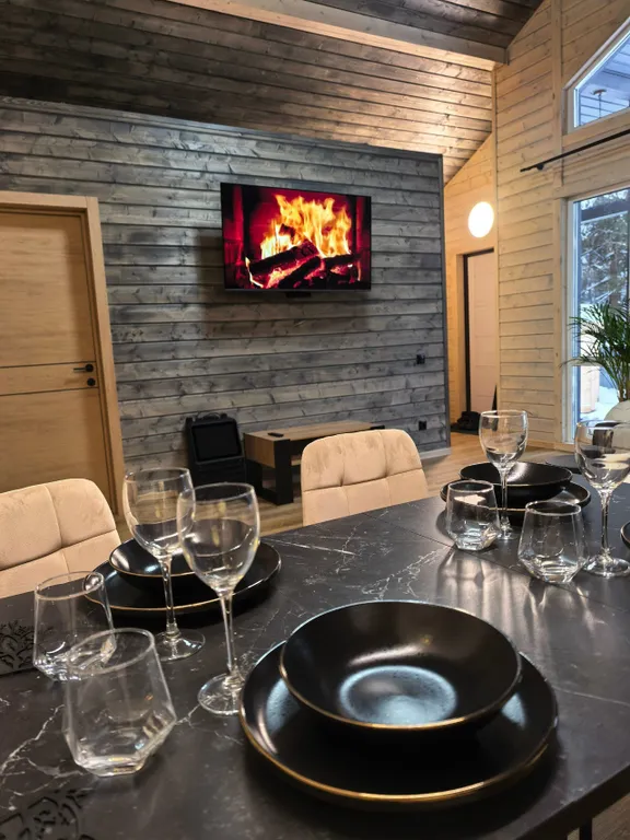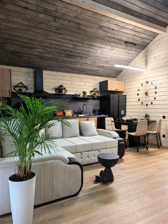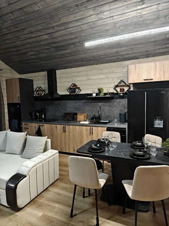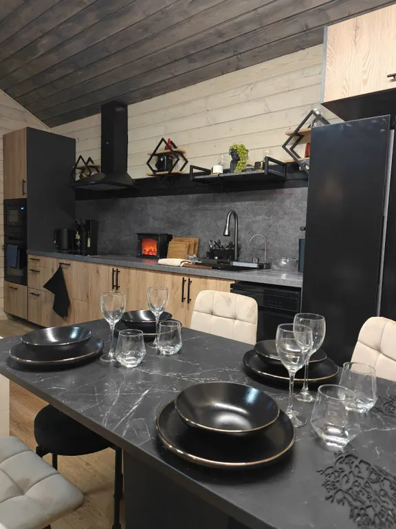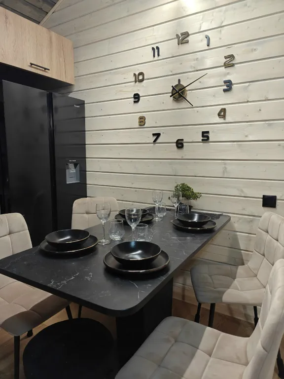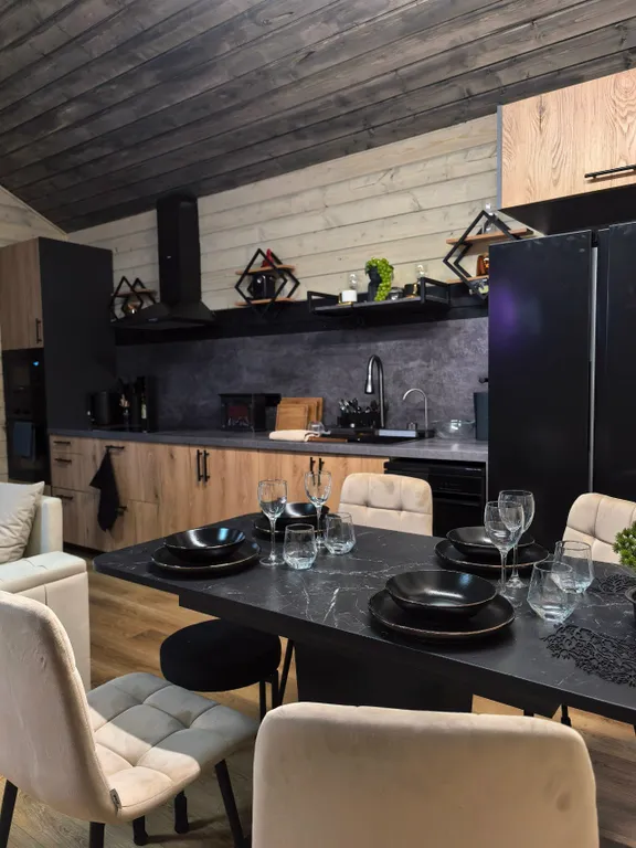 Кухня-гостиная с дизайнерской мебелью, посудой для сервировки, огромным смарт тв и проектор для атмосферы.